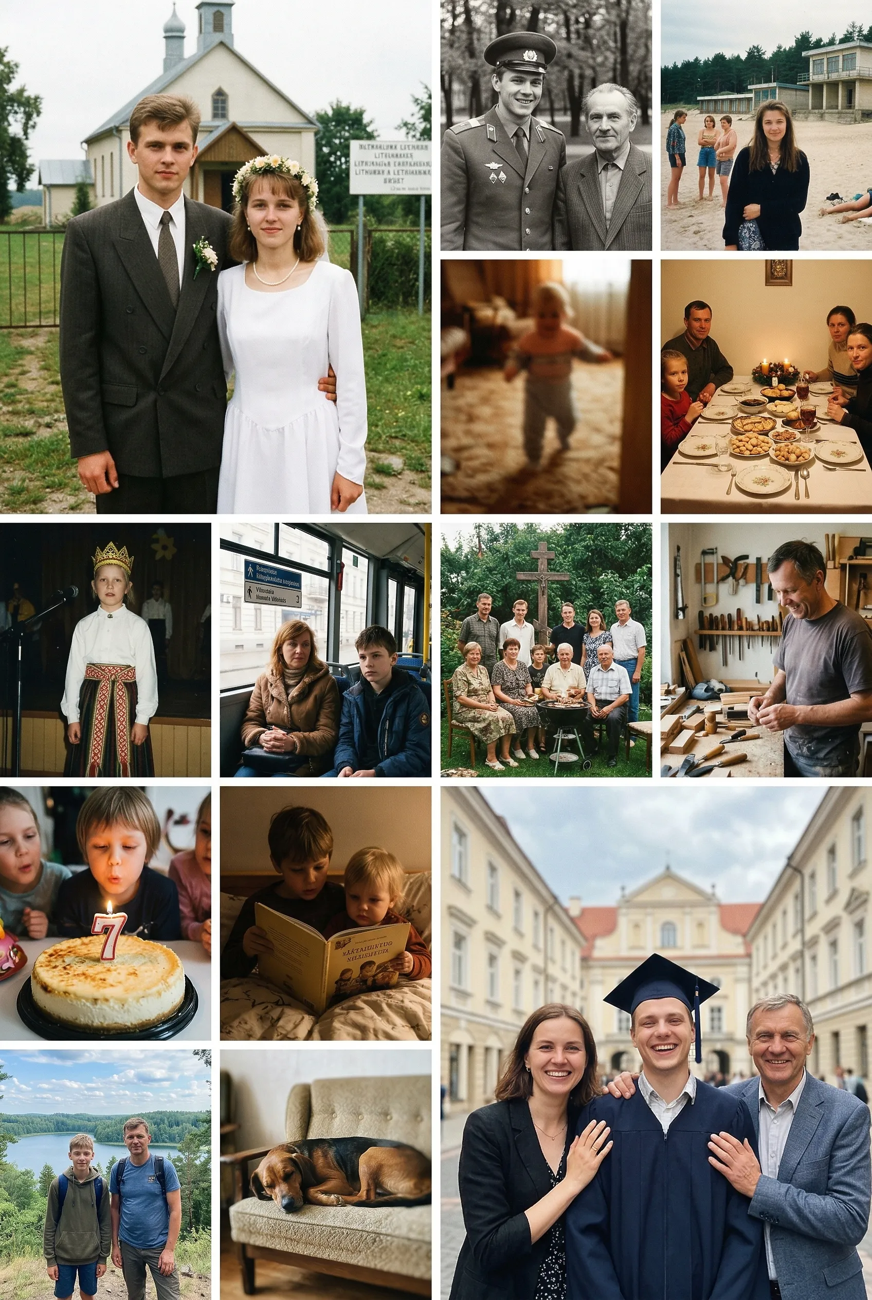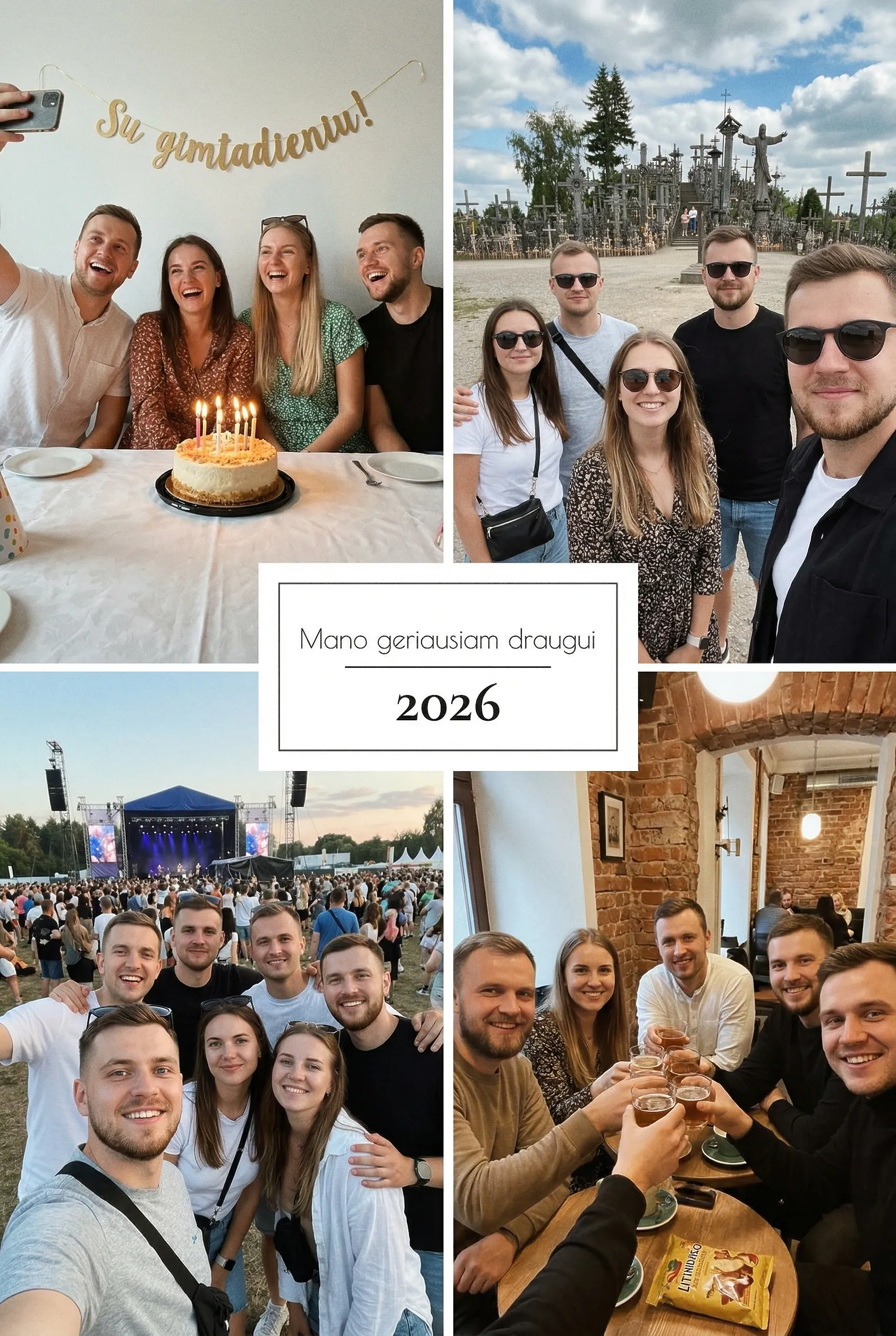 Nuotraukų koliažo šablonas su asmeninėmis nuotraukomis ir tekstu